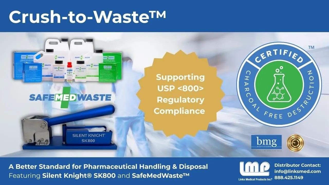 Crush-to-Waste™, distributed by Links Medical Products®, is an integrated hazardous drug handling and destruction system designed to support USP <800>–aligned practices by addressing both delivery controls and on-site pharmaceutical destruction within a single, coordinated workflow.