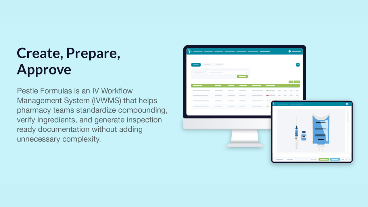 Pestle Formulas is a comprehensive IV Workflow Management System (IVWMS), designed to enhance safety, efficiency, and standardization in compounding environments. By combining advanced verification tools with centralized documentation, the platform helps pharmacies modernize IV room operations and reduce the risk of compounding errors.