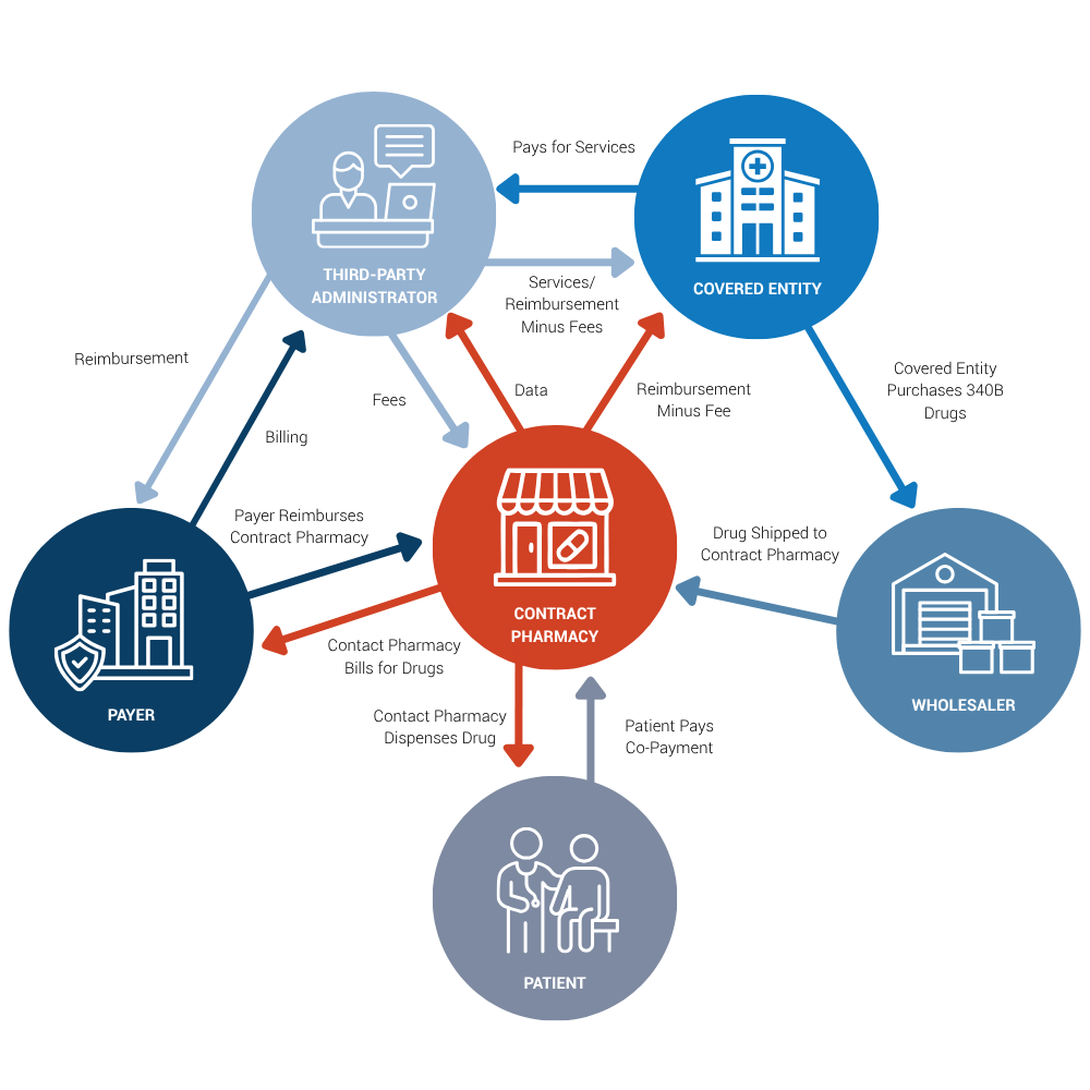 The following diagram outlines the 340B contract pharmacy arrangement, including the key players involved and their interactions.